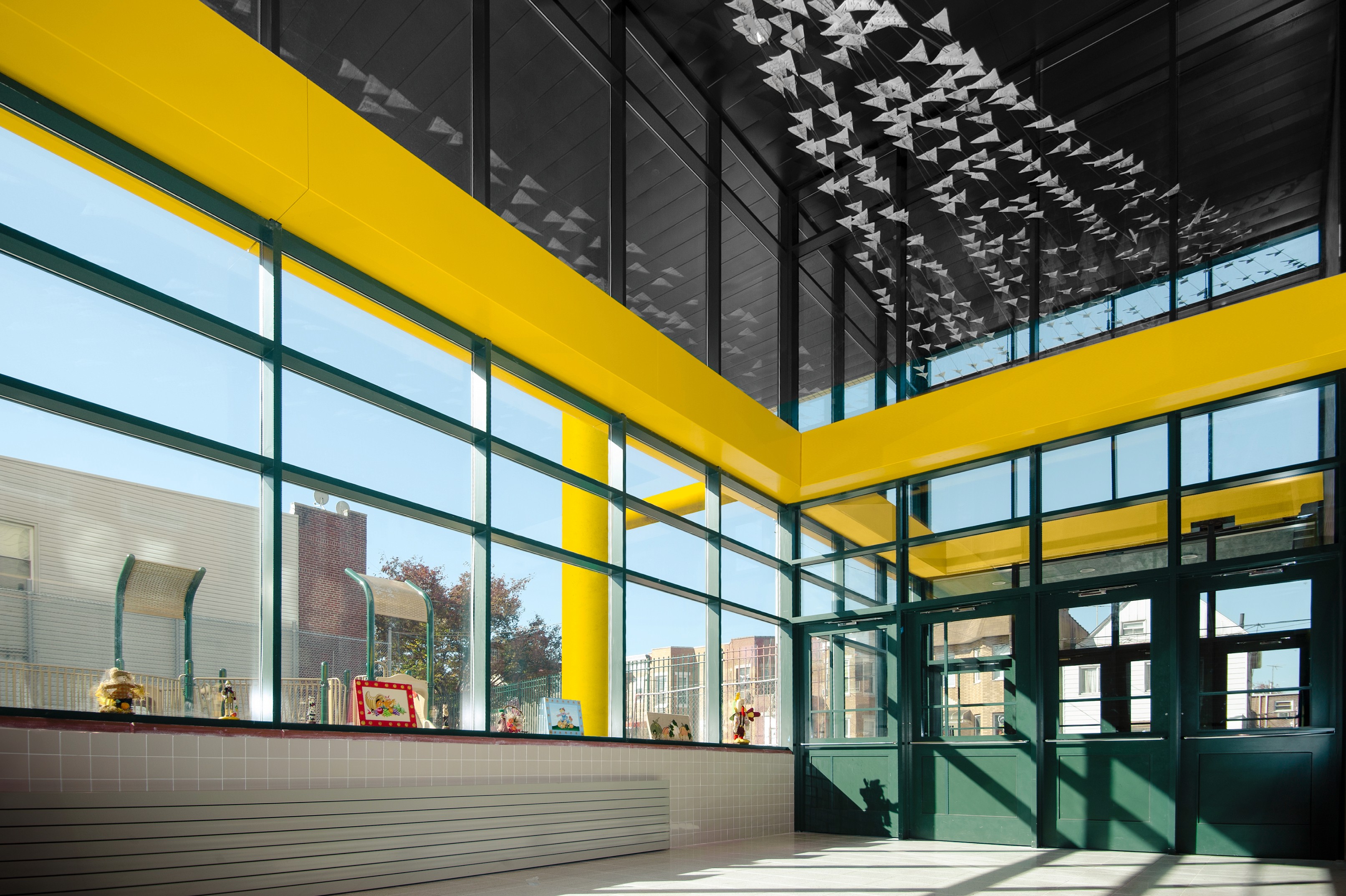 The new building organizes its spaces vertically, positioning the gymnasium below an auditorium and stacking an outdoor playground on the lower roof to maximize site use. This configuration links both schools, creating shared access for students and the community during after-school programs.